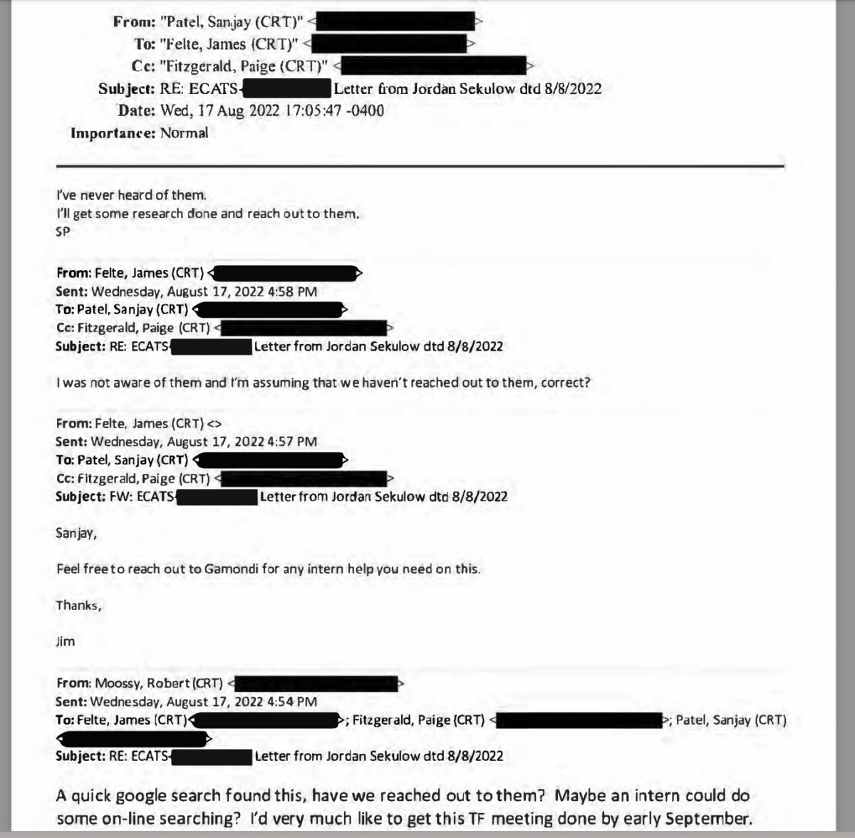- Ignored pro-life victims, courted abortion NGOs. While pregnancy resource centers and churches faced firebombings and vandalism after the 2022 Dobbs decision, the Task Force delayed outreach to pro-life groups until September 2022 and internally debated whether such facilities even qualified for FACE Act protection. In contrast, Task Force Director Sanjay Patel maintained near-constant contact with NAF, Planned Parenthood, and the Feminist Majority Foundation. NGOs provided “dossiers” on activists and received internal DOJ data in return, including lists of active FACE Act cases and terms of release for defendants.