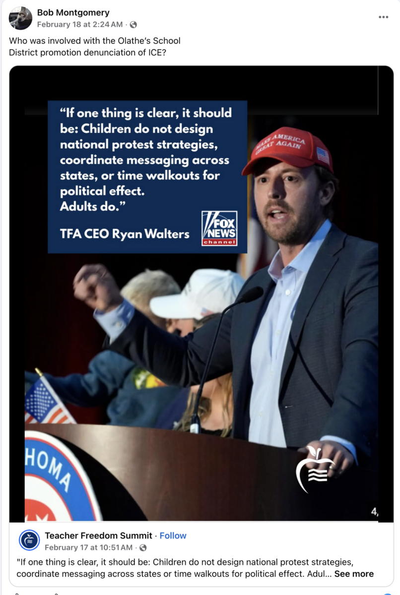 Officials with Olathe Public Schools clarified, in statements reported by KCTV5, that the walkout and demonstration were student-led and not organized or endorsed by the district. Numerous social media comments reportedly from parents have taken issue with that assertion, particularly after a social media post reportedly made by an Olathe school district official’s spouse advised the public of an ICE operation in the area on Feb. 17.